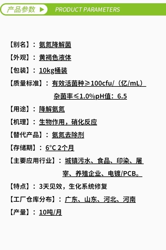 本品是經過篩選培養的超強硝化細菌,具有更強生物活性及耐毒性,同時產品添加營養元素,可以顯著提高細菌的生長繁殖速度,更好抵抗負荷沖擊,穩定污水系統的硝化效率。