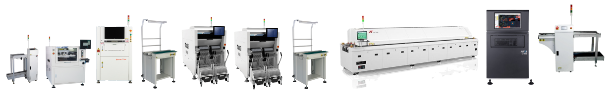 全自動上板機→ 全自動印刷機GKG GSE→思泰克SPI →接駁臺 →RX-7→ RX-7→ 接駁臺→ 勁拓回流焊→ 矩子在線AOI → 下板機(從左→ 右)