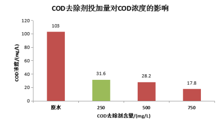 通過小試數據,在pH值為7.5的情況下,最終選擇濃度為250mg/L的COD去除劑,處理效果最佳,可確保出水COD達標。該去除效果相比之前客戶使用聚合氯化鋁噸水處理成本降低33%,去除效率更高。