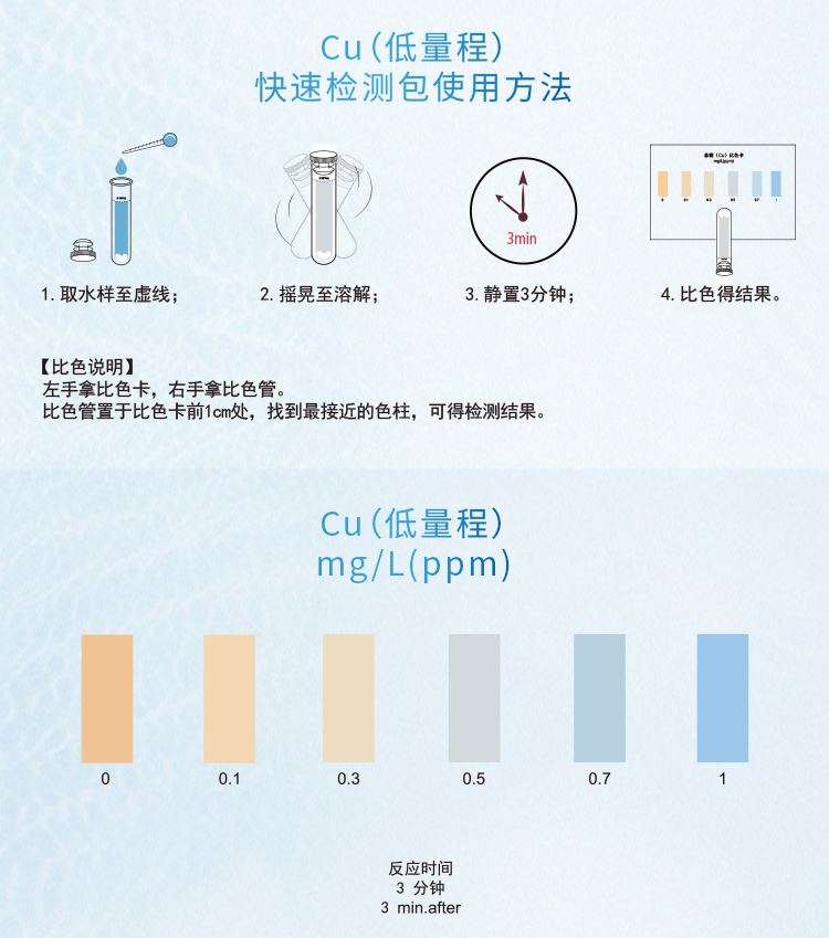 2.本產品檢測水中銅離子(Cu2+)含量在0.5-10mg/L(ppm)范圍內,濃度過高會產生黃棕色沉淀而影響比色,若要檢測10mg/L以上濃度水樣,請預先稀釋水樣后再進行測定,具體操作見稀釋說明書。