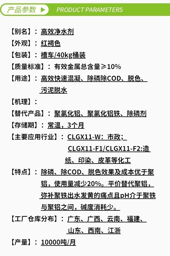兼具鐵鹽的沉降速度快,處理成本低和鋁鹽的凈水效果優良的特點,是一種新型復合的無機高分子凈水劑,具備高效除磷、除COD、除油除濁、脫色等功效。